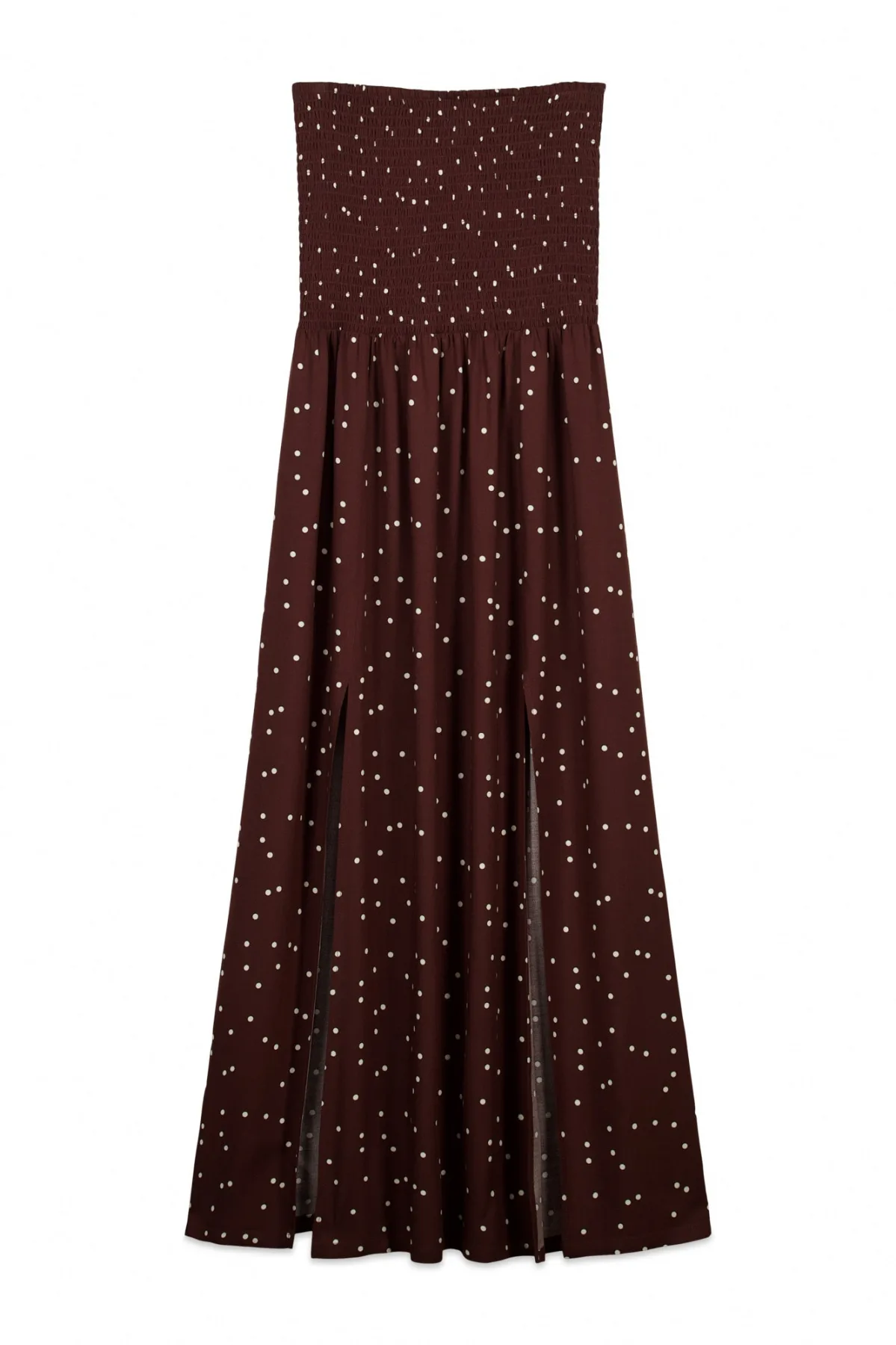Design: Beenopening; Type sluiting: Slip; Materiaal: Viscose; Motief: Gestippeld; Soort bandjes: Bandeau; Details: Gedrapeerd; Extra's: All-over patroon; Lengte: Lang/maxi; Pasvorm: Normale pasvorm; Armlengte: Mouwloos