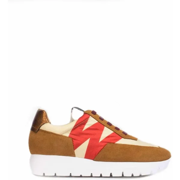Bruine suède leren sneakers in een combinatie van rood en crèmekleurig nylon. Deze urban sneaker heeft een frisse touch met een geprint logodetail en een niet-verstelbare elastische sluiting in een contrasterende kleur. De uitneembare interne MemoryGel-binnenzool dempt je voet. De zool is ontwikkeld met WondersFly ™ -technologie en biedt extreme lichtheid en comfort bij elke stap. Maak je klaar voor het gevoel, YES WE FLY.