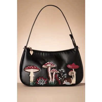 ''It has mush-room for all your essentials!'' We hebben het natuurlijk over deze leuke handtas uitgevoerd in zwart imitatie leder met geborduurde paddenstoelen en een egeltje, afgewerkt met een ritssluiting, een kort hengsel en een langer, afneembaar hengsel. * Medium sized * Ritssluiting * Binnenvak met 3 extra vakjes, waarvan 1 met rits * Vakje met rits achterzijde * Volledig gevoerd * Langer, afneembaar hengsel * Kan crossbody gedragen worden * Groot genoeg voor je telefoon, sleutels en je portemonnee