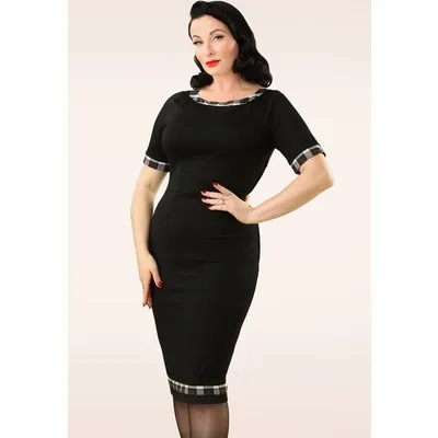 Deze Work It Out Check Trim Pencil Dress in Black is sexy EN super sophisticated! Dit nauw aansluitende prachtexemplaar heeft een elegante boothals, korte mouwen en contrasterende geruite biezen. Uitgevoerd in een stevige maar soepele, zwarte stof met een lichte stretch die je rondingen prachtig benadrukt. Omarm het verleden en herleef de fabulous fifties in deze beauty! * Aansluitend model * Boothals * Korte mouwen * Blinde rits zijkant * Split achterzijde * Ava is 1,69 m