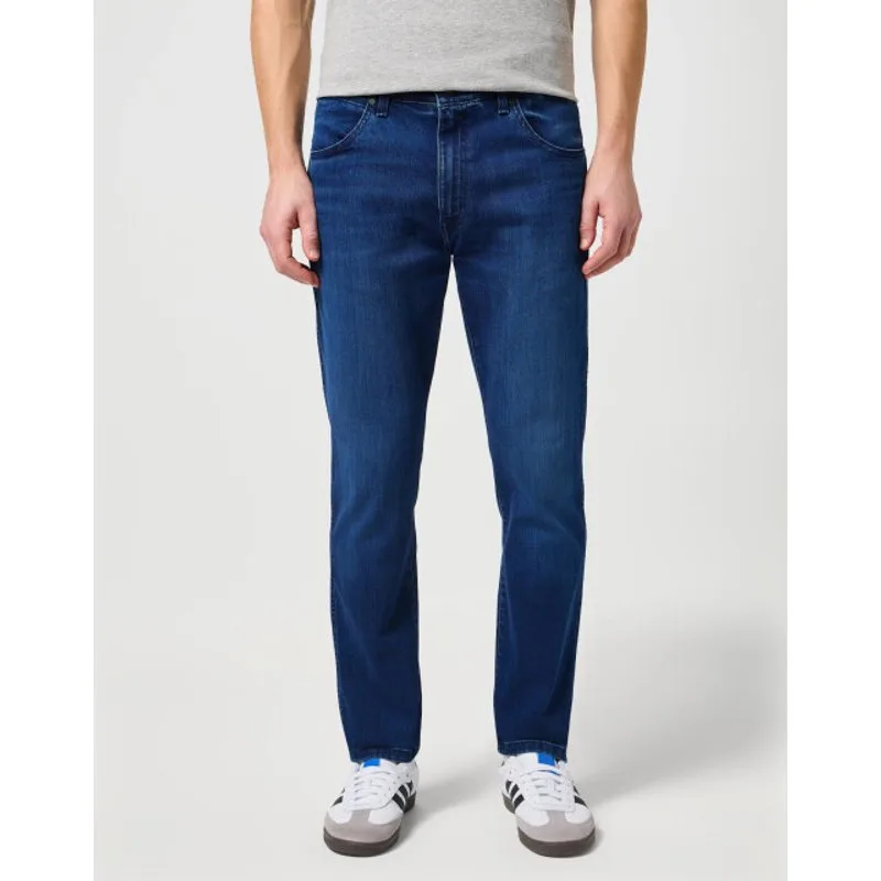 Deze heren jeans van Wrangler is voorzien van stretch. De Larston is uitgevoerd met taps toelopende pijpen. Op de achterzak staat het bekende W-stiksel met de logo patch van Wrangler. De broek is gemaakt van 91% katoen, 7% elastomultiester en 2% elastaan.