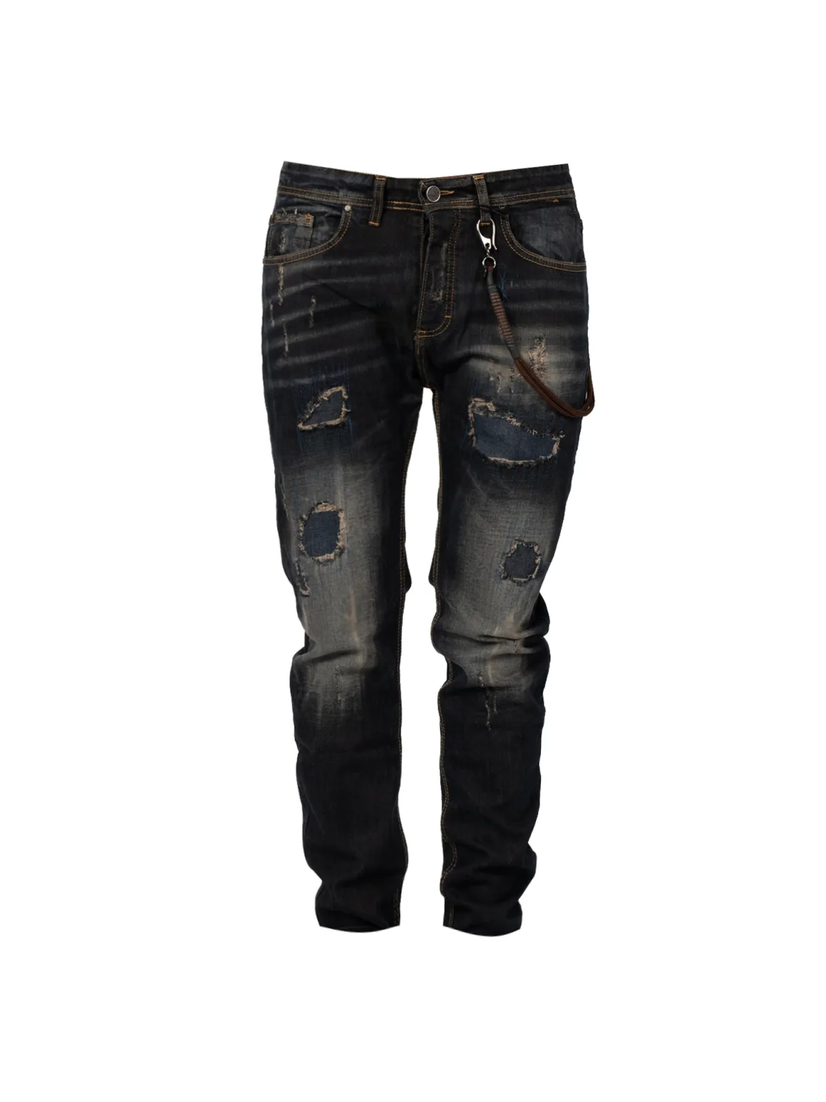 Kan worden vastgemaakt met logoknopen Nauwsluitende, taps toelopende pijpen Met gemiddelde stijging Drie zakken voor, twee achter Met slijtage, schaafplekken en vlekken op de pijpen en zakken Afneembaar trekkoord aan de lussen Gewatteerd met rood garen Gemaakt van denim van hoge kwaliteit Met stretchgehalte Gemaakt in Italië