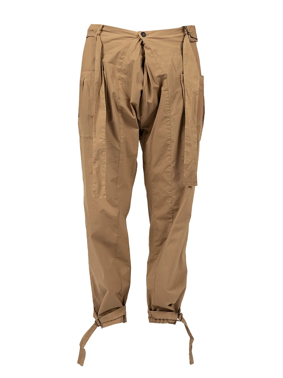 Getailleerde pasvorm Met laag kruis Knoopsluiting Met extra verstelbare riem Twee zakken aan de zijkant, twee ingezette zakken aan de achterkant Broek versierd met decoratieve koorden Gemaakt van hoogwaardige stof