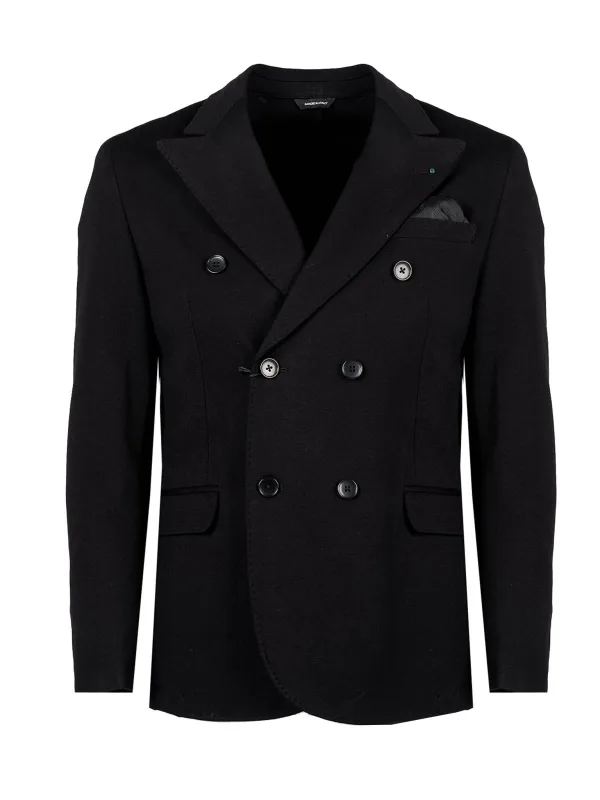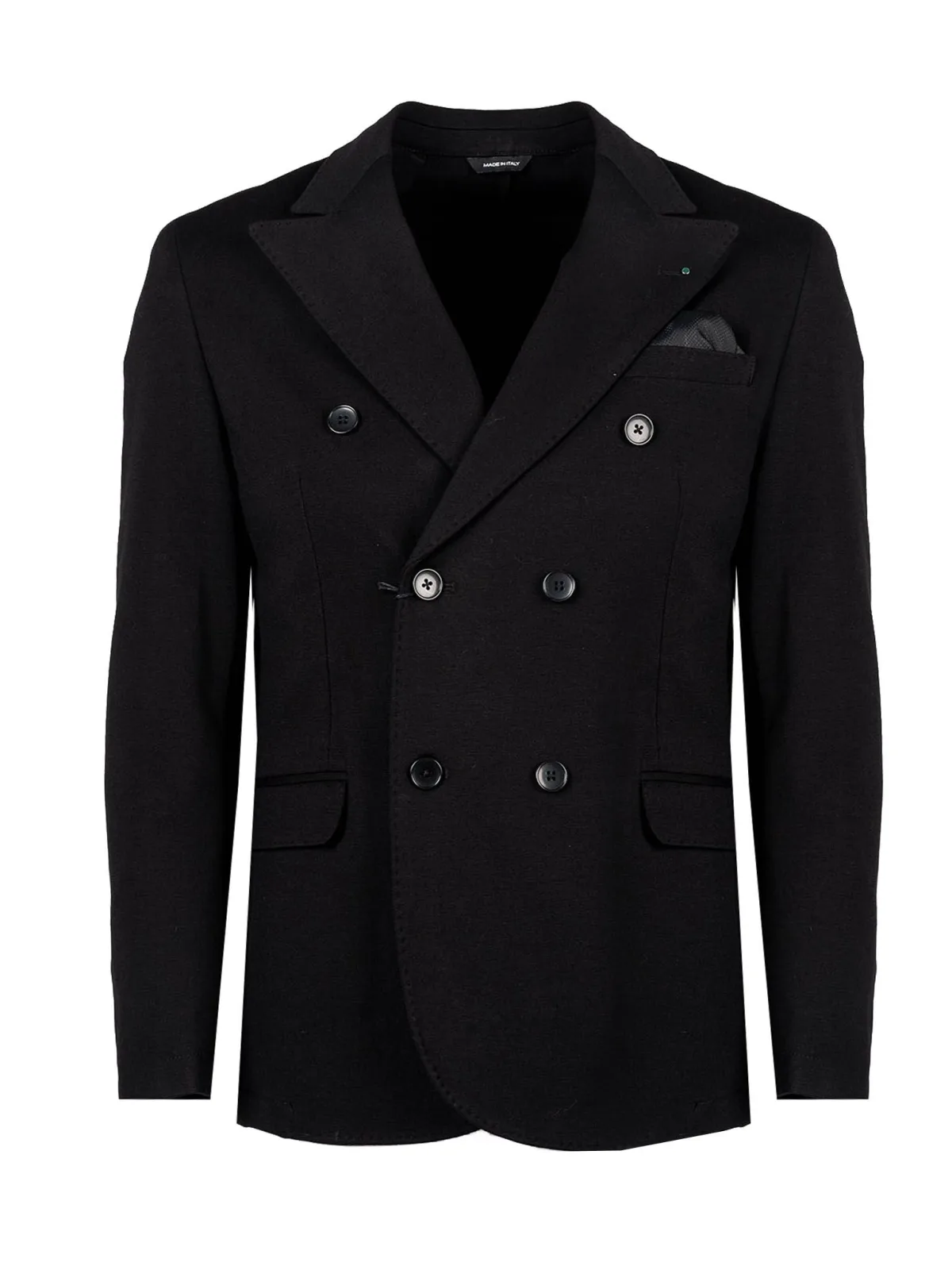 Getailleerde snit met dubbele rij knopen Sluiting met twee knopen Gedeeltelijk met voering Drie zakken aan de voorkant, één aan de binnenkant Eén zak op de linkerborst, versierd met een pochet Met figuurnaden Met twee splitten aan de achterkant De manchetten kunnen worden vastgemaakt met vier knopen Gemaakt van hoogwaardige stof Gemaakt in Italië