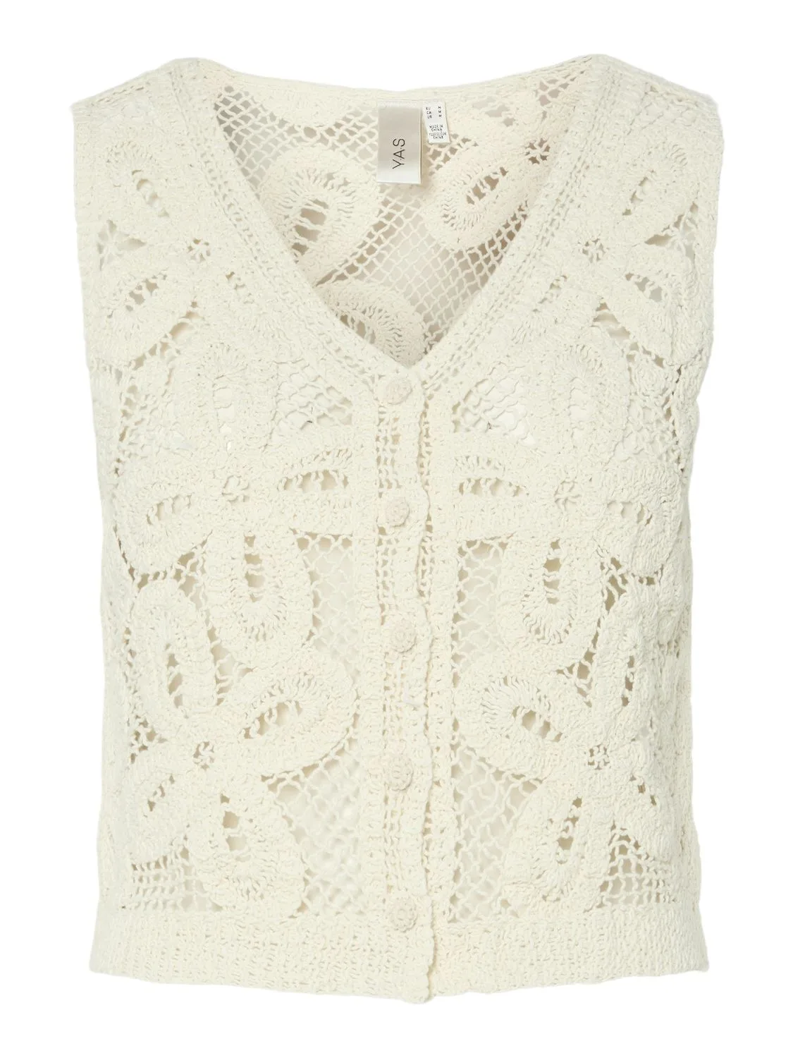 De Top Sanula van Y.A.S. is een stijlvolle top met een cropped fit en een elegante v-hals. Gemaakt van katoen met een uniek gaatjespatroon en knopen als sluiting, biedt deze top een modieuze en luchtige uitstraling zonder mouwen.