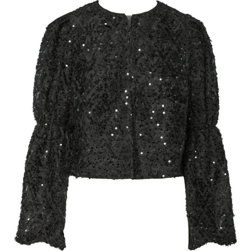 Deze zwarte blouse-jasje van y.a.s heeft subtiele glans en een verfijnde afwerking die direct opvalt; het glad gevoerde binnenwerk voelt zacht aan. De borduursels en pailletten laten deze top prachtig spreken. Met een ronde hals en een normale lengte oogt de top tijdloos, terwijl de mouwen juist zorgen voor een speelse twist die je outfit meteen verheft. Gemaakt van een soepele mix van elastane en polyester behoudt de blouse haar vorm en laat ze je bewegingen volgen zonder te vervormen, en de sluiting met kleine haakjes geeft een nette, verzorgde indruk. Was haar voorzichtig om de fijne details te beschermen. Er is geen garantie op verlies van pailletjes.