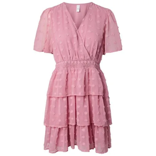 Deze roze zomerjurk met pofmouwen van Y.A.S is een lichte en speelse keuze voor warme dagen en feestelijke momenten. De korte lengte, V-hals en subtiele textuur geven een luchtige uitstraling, terwijl de volant aan de onderkant zorgt voor extra beweging bij elke stap. Door de elastische tailleband sluit de jurk mooi aan rond de taille en blijft het model toch comfortabel.Details die deze jurk bijzonder maken Kort model, ideaal voor zomerse temperaturen en feestelijke gelegenheden V-hals die het decolleté elegant laat uitkomen Korte pofmouwen voor een moderne, vrouwelijke look Effen roze kleur, makkelijk te combineren met sandalen of hakken Elastische tailleband voor een comfortabele pasvorm en een geaccentueerde taille Volant aan de zoom voor extra volume en een speels effect Lichte, soepele stof met zichtbare textuur Zonder zakken, waardoor de jurk mooi slank langs het lichaam valt Maatadvies: dit artikel valt normaal Onderhoud: handwas, niet strijken en niet drogen in de droogtrommelKlaar voor bruiloft, borrel of zomers feestjeDeze jurk past goed bij gelegenheden zoals een bruiloft als gast, een feest of een zomerse borrel. Combineer met fijne sieraden en een kleine tas voor een verzorgde, feestelijke outfit.Y.A.S studio collectieDe studio collectie van Y.A.S focust op modieuze items met een doordacht design en eigentijdse details. Je kiest hiermee voor een jurk die past in een moderne garderobe en die moeiteloos meebeweegt van dag naar avond.Een luchtige jurk om je zomerse momenten een verzorgde, feestelijke uitstraling te geven.
