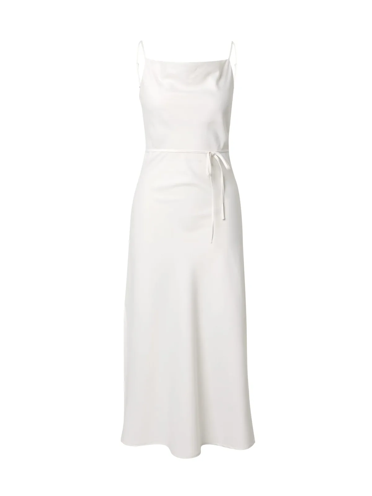 Design: Gevoerde zoom/rand, Tailleriem, Uitgesneden rug; Materiaal: Gerecycled materiaal; Halstype: Watervalhals; Motief: Effen; Soort bandjes: Spaghettibandjes; Extra's: Op staal naden, Buigzame grip; Lengte: 3/4 lengte; Snit: Getailleerd; Pasvorm: Slanke pasvorm; Armlengte: Mouwloos