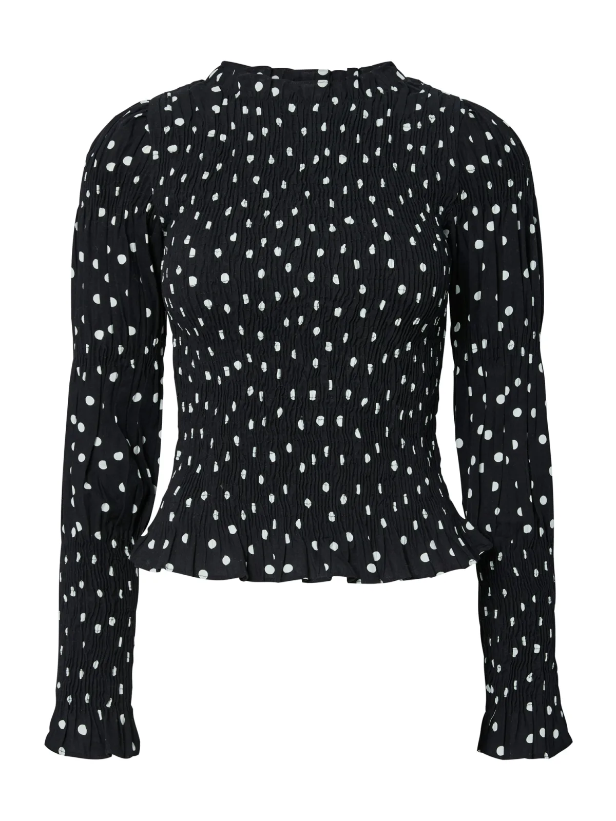 Blouse type: Blouseshirt; Design: Gevoerde zoom/rand, Recht model; Materiaal: Katoen; Motief: Gestippeld; Kraag: Opstaande kraag; Details: Ruches, Volant, Gedrapeerd; Extra's: All-over patroon, Gladde stof; Pasvorm: Slanke pasvorm; Armlengte: Lange mouw; Lengte: Normale lengte