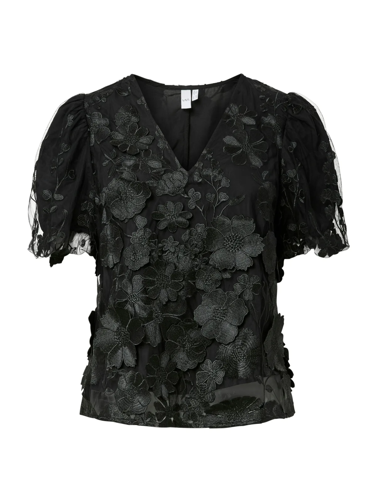 Blouse type: Blouseshirt; Design: Rechte zoom, Pofmouwen; Halstype: V-hals; Motief: Bloemenprint; Kraag: Zonder kraag; Details: Borduursels, Gedrapeerd; Extra's: Applicaties, Lichte stof; Pasvorm: Normale pasvorm; Armlengte: Halve mouw; Lengte: Normale lengte
