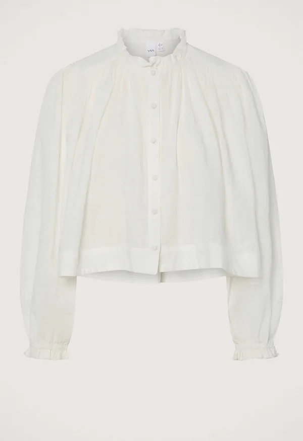 Dit is de 26039535 Breeze Long Sleeved Blouse van het merk YAS. Deze Blouse heeft een cropped pasvorm, gemaakt van 100% biologisch katoen. De opstaande kraag met ruches en de volledige knoopsluiting aan de voorkant zorgen voor een elegante uitstraling. Verder zijn de schouders licht geplooid en zijn de lange mouwen voorzien van elastische manchetten voor een licht ballon effect. Het boxy silhout met volume zorgt voor lucht en beweging, ideaal voor verschillende gelegenheden.