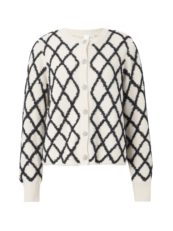 Design: Geribbelde kraag, Knop placket, Geribd ceintuurtje; Type sluiting: Knoopsluiting; Materiaal: Knitwear; Halstype: Ronde hals; Motief: Geruit; Details: Borduursels; Extra's: Fully fashioned, Voelt zacht aan; Pasvorm: Losse pasvorm; Armlengte: Lange mouw; Lengte: Normale lengte