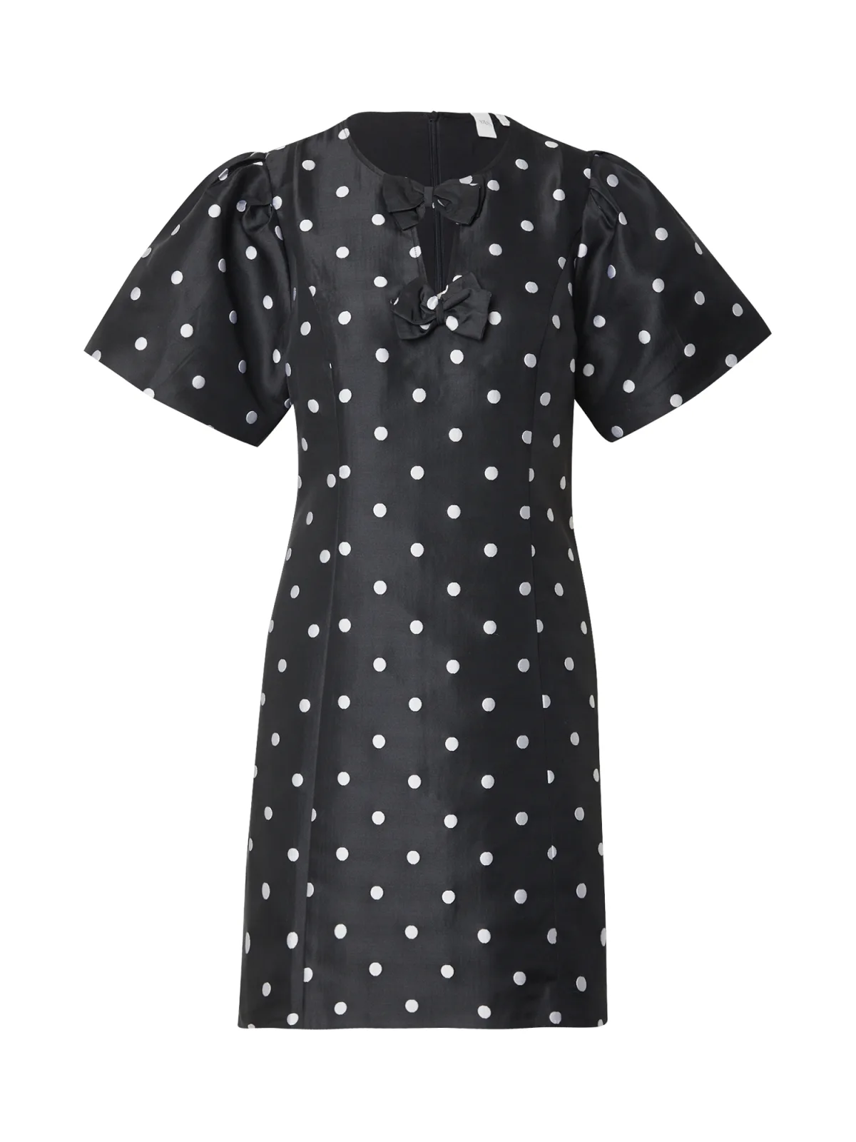 Design: Pofmouwen, Rug rits; Type sluiting: Ritssluiting; Materiaal: Satijn; Halstype: Ronde hals; Motief: Gestippeld; Kraag: Zonder kraag; Details: Cut-outs, Gedrapeerd; Extra's: All-over patroon, Applicaties, Gladde stof; Lengte: Kort/mini; Snit: Getailleerd; Pasvorm: Slanke pasvorm; Armlengte: Kwartmouw