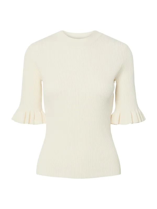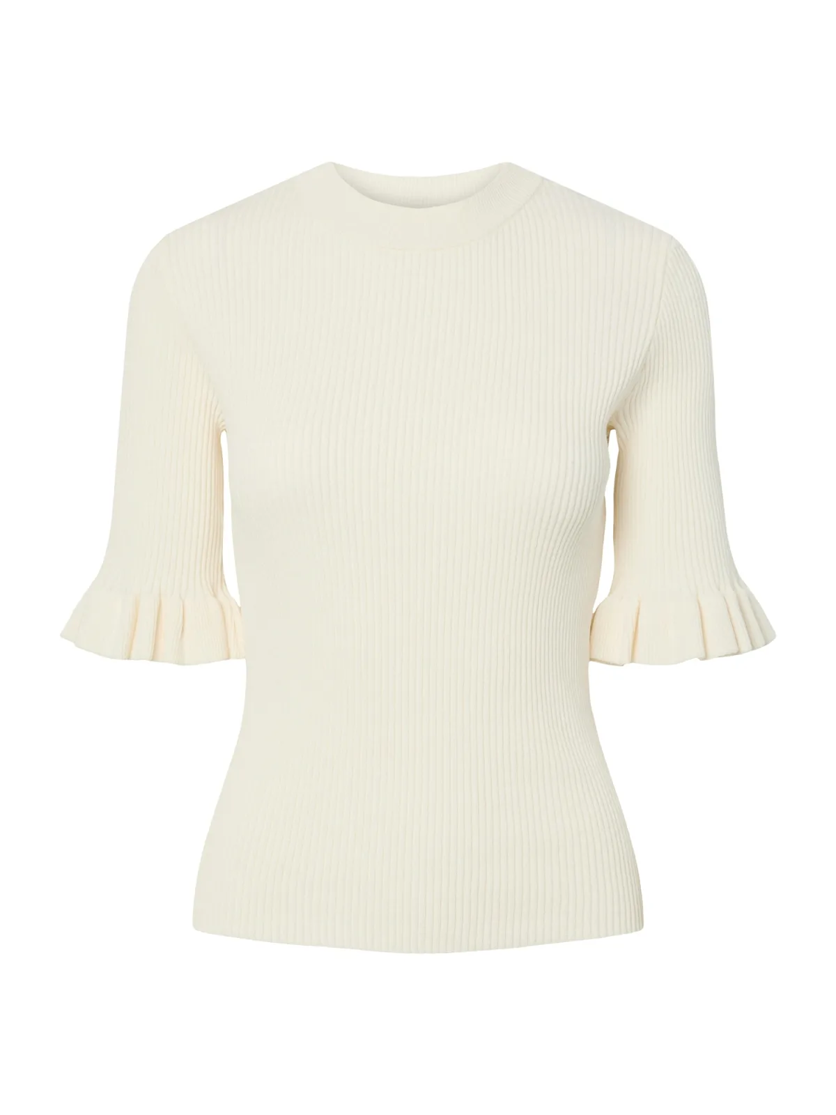Design: Geribbelde kraag, Rechte zoom; Materiaal: Knitwear; Halstype: Ronde hals; Motief: Effen; Details: Ruches; Extra's: Met textuur, Voelt zacht aan; Pasvorm: Slanke pasvorm; Armlengte: Halve mouw; Lengte: Normale lengte