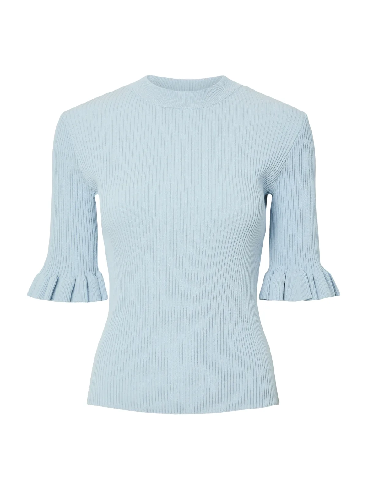 Design: Geribbelde kraag, Trompetmouwen; Materiaal: Knitwear; Halstype: Ronde hals; Motief: Effen; Details: Ruches; Extra's: Met textuur, Voelt zacht aan; Pasvorm: Slanke pasvorm; Armlengte: Halve mouw; Lengte: Normale lengte