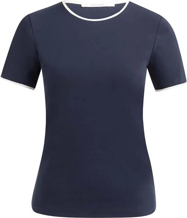 T-shirt van Yaya met ronde hals, korte mouwen en een effen, donkerblauwe kleur. De contrasterende bies langs hals en mouwzoom geeft een strakke, minimalistische afwerking. De aangesloten pasvorm draagt comfortabel en oogt verzorgd. Combineer met een blazer of een jeans voor casual of netjes.