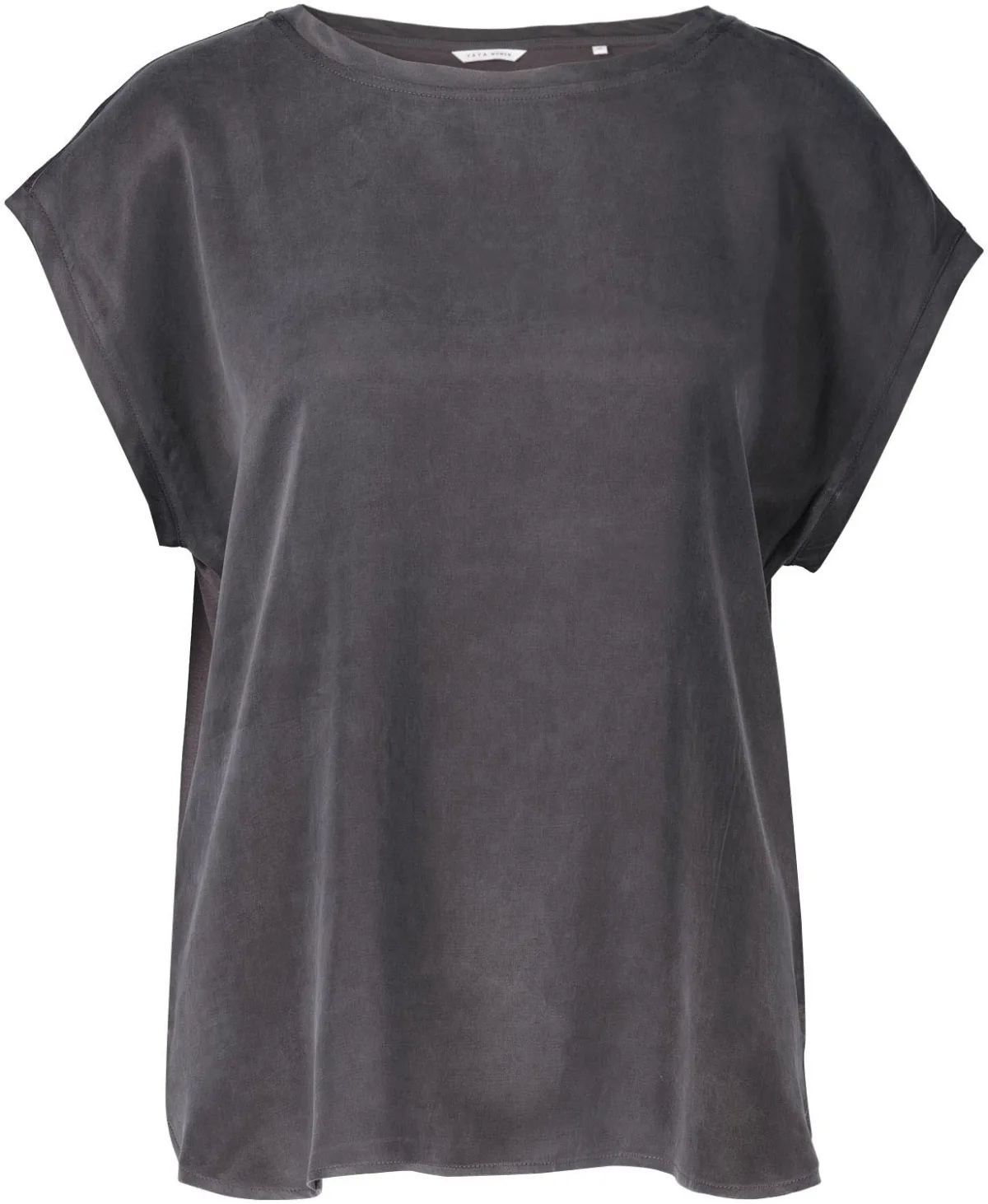 Met dit item kun je echt alle kanten op! Deze zwarte top heeft een ronde hals en korte mouwen. De voorzijde van de top is gemaakt van een mooie zijdeachtige stof en de achterzijde van een heerlijk zachte stof. Het perfecte item om bijvoorbeeld onder een leuk vest te dragen.