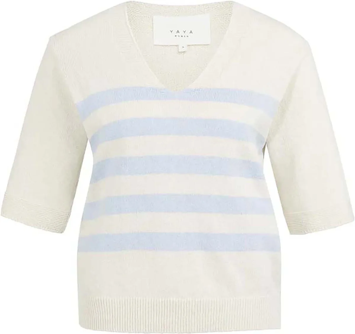 Trui van Yaya met V-hals en regular pasvorm. Het streeppatroon in zachte tinten geeft een minimalistische, casual uitstraling. 3 kwart mouwen met ribgebreid mouwboord en een brede ribzoom zorgen voor een nette afwerking. Combineer met een lichte jeans of een pantalon.