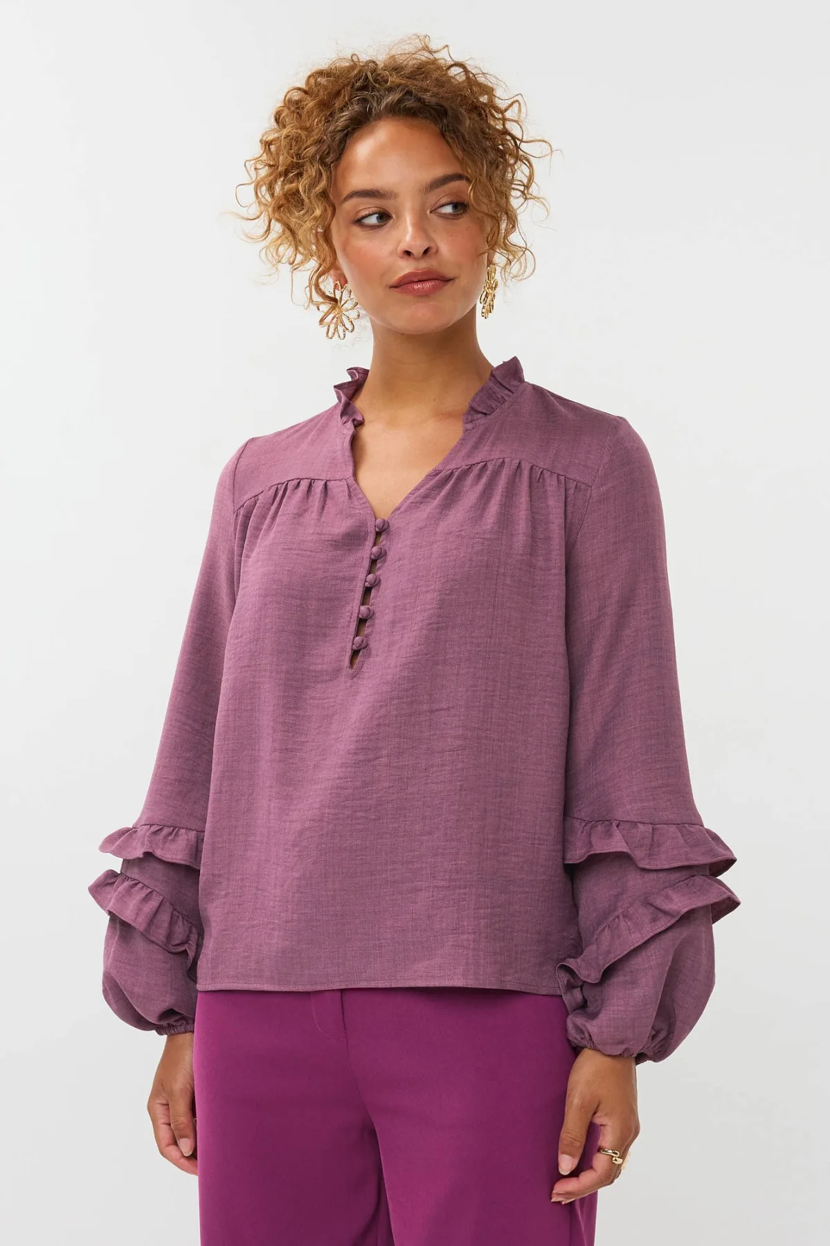 Deze Ydence Jacky blouse heeft lange pofmouwen en een V-hals. De blouse is gemaakt van polyester en heeft een knoopsluiting, ruches langs de voorzijde zorgen voor een speelse uitstraling.