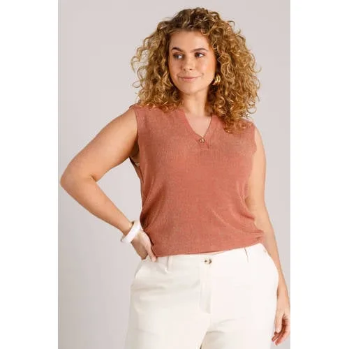 De oudroze top Lorena van Yest Curve is een luchtige zomertop met een subtiele glans, ideaal voor warme dagen of een avondje uit. De effen kleur in oudroze oogt rustig, terwijl de fijne metallic draad in de stof zorgt voor een zachte shimmer. Door de V-hals en knoopsluiting aan de voorkant ontstaat een open, lichte look die mooi langs het lichaam valt.Details die het verschil maken Mouwloos model, geschikt voor zomerse temperaturen of onder een blazer of vest V-hals met knoopsluiting aan de voorkant voor een verfijnd en licht open decolleté Gemaakt van een soepele viscosemix met metallized fibre voor een zachte stof met subtiele glans Effen oudroze kleur, goed te combineren met jeans, een nette broek of rok Onderdeel van de 'Daily' collectie, bedoeld voor dagelijks gebruik in het zomerseizoen Wasbaar op 30 graden, waardoor het onderhoud eenvoudig blijftComfortabele zomerbasic voor grote matenDeze top is onderdeel van het grote maten assortiment en is ontworpen met extra aandacht voor ruimte en draaggemak. De luchtige stof voelt soepel aan op de huid en beweegt met je mee. Combineer de Lorena met een lichte broek of rok voor een zomerse outfit met een rustige, egale uitstraling.Yest Curve voor vrouwelijke pasvormenYest Curve richt zich speciaal op dames met een grotere maat en vertaalt modieuze stijlen naar pasvormen met meer ruimte en comfort. De collecties sluiten aan bij het dagelijkse leven, met items die goed te combineren zijn en comfortabel dragen. Met deze top Lorena haal je een doordacht ontworpen basis in huis die je vaak kunt dragen.Een praktische keuze als je graag een luchtige, glanzende top wilt die zacht aanvoelt en eenvoudig te stylen is.