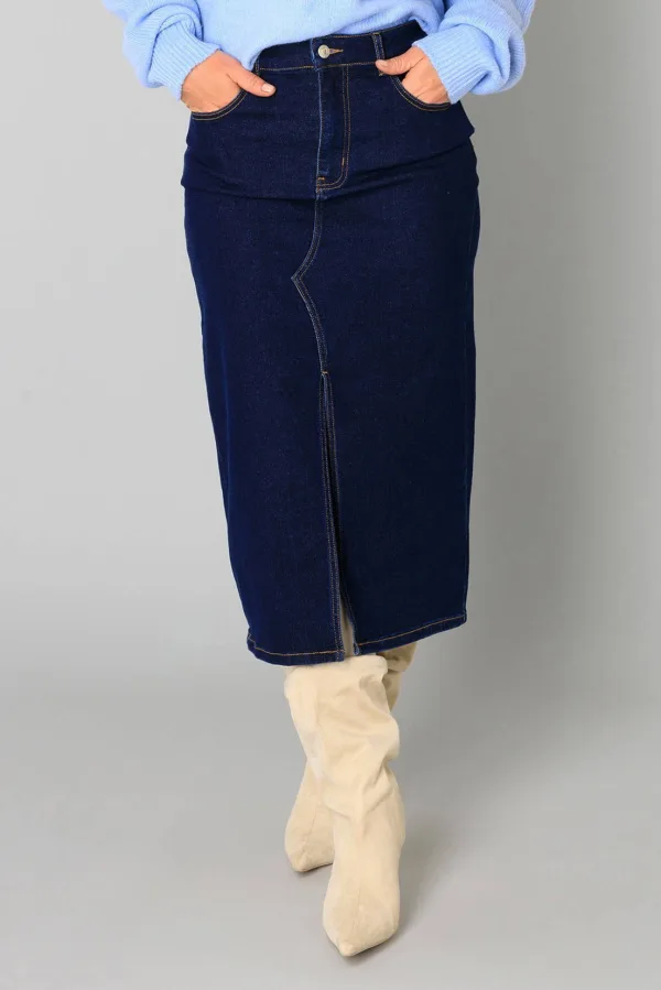 Deze Yest rok is een midi rok gemaakt van denim. De rok heeft een rits- en knoopsluiting en een split aan de voorkant. Je vindt vijf broekzakken voor handige opbergruimte.