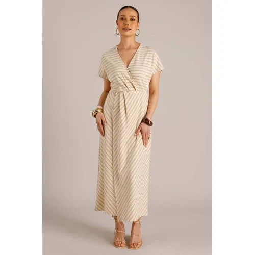 Deze katoenen zomerjurk met streepprint van Yest vormt een basis voor zonnige dagen. De ecru/taupe strepen geven een rustige uitstraling die makkelijk te combineren is met sandalen of sneakers. De middel-lange lengte en korte mouwen maken de jurk geschikt voor zowel werk als vrije tijd, terwijl de V-hals en het overslag detail zorgen voor een vrouwelijk silhouet.Details die je elke dag kunt dragen Middel-lange jurk, geschikt voor zomerse dagen en milde avonden Streepprint in ecru/taupe voor een zachte, rustige uitstraling V-hals met overslag detail en plooien, waardoor de stof langs het lichaam valt Korte, rechte mouwen die comfortabel vallen rond de armen Gemaakt van 97% katoen en 3% overige vezels voor een soepele touch Geen sluiting en geen zakken voor een strak en rustig silhouet Wasbaar op 30 graden, handig in het dagelijks onderhoudVoor jouw dagelijkse zomerlookDeze jurk past goed bij de dagelijkse garderobe. Draag de zomerjurk met slippers naar het strand of met een lichte blazer en sandalen naar kantoor. De streepprint en neutrale kleuren maken het eenvoudig om accessoires toe te voegen, zoals een tas in een contrasterende tint.Yest: eigentijdse stijlen voor elke dagYest richt zich op moderne vrouwen die houden van toegankelijke mode met een vrouwelijke uitstraling. De collecties zijn afgestemd op het dagelijks leven, met items die makkelijk te combineren zijn. Zo voeg je met deze jurk eenvoudig een extra optie toe aan je kast.Een praktische keuze als je op zoek bent naar een lichte, gestreepte zomerjurk voor elke dag.