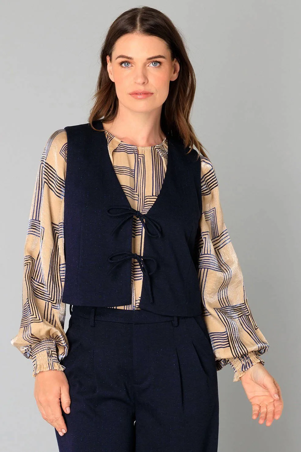 Dit gilet van Yest is mouwloos en heeft een V-hals met striksluiting. De stof bevat lurex en een strikje, gemaakt van polyester, viscose, metallized fibre en elastaan.