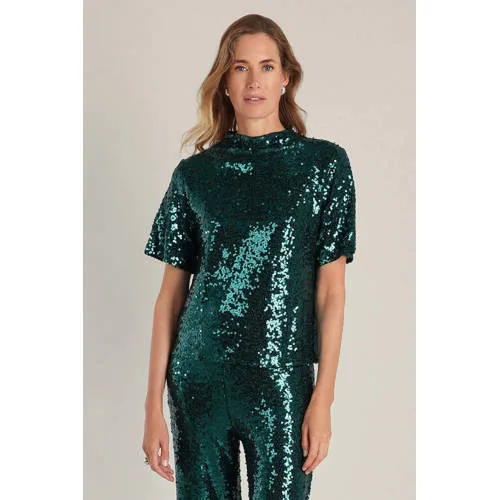 Deze top van Yest heeft korte mouwen en een ronde hals. De top is gemaakt van 100% polyester. Met pailletten op de voorkant, rechte mouwen en een kleur draag je dit item makkelijk bij verschillende outfits.
