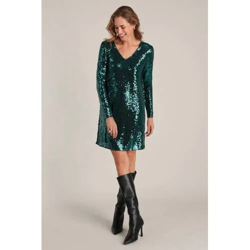 Deze jurk van Yest heeft een V-hals en rechte mouwen. De jurk is kort. De stof heeft pailletten, dat zorgt voor een feestelijk effect. Je draagt deze jurk makkelijk bij verschillende gelegenheden.