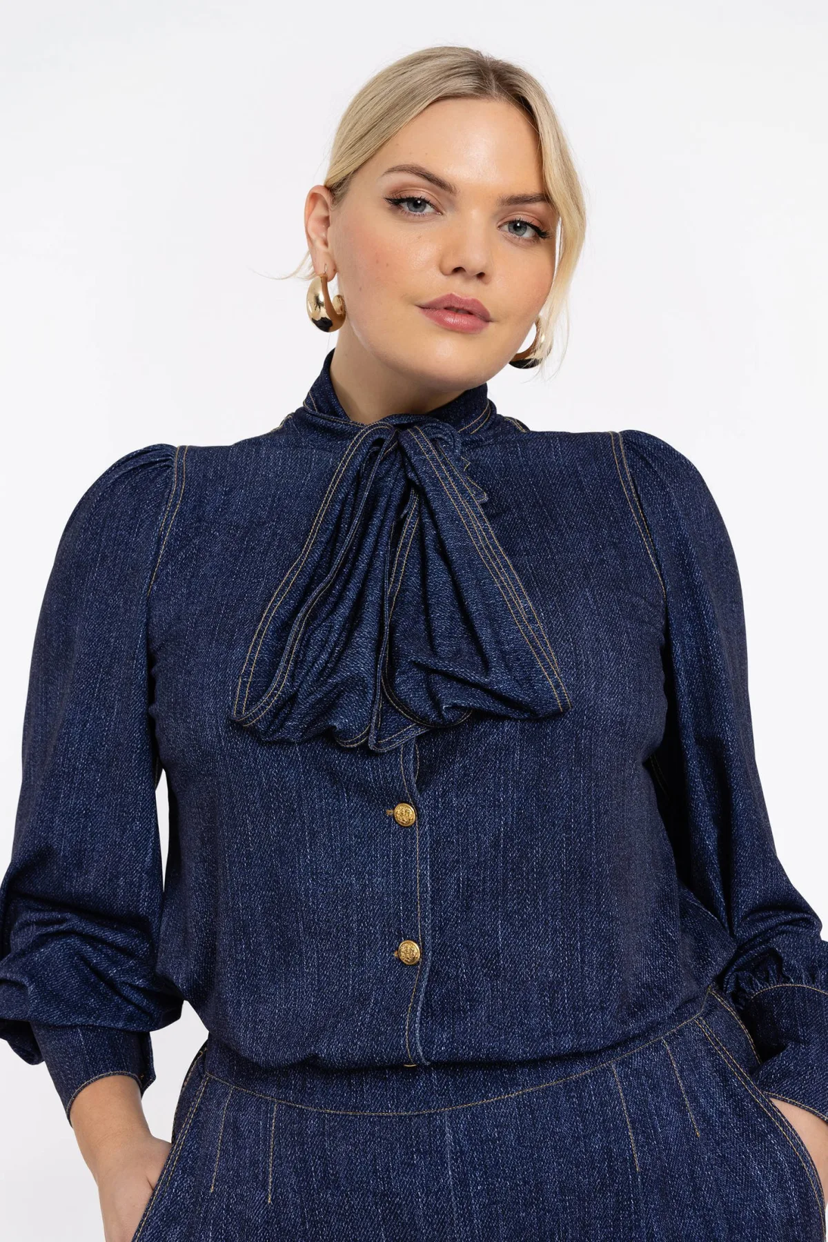 Design: Knop placket, Zonder kraag, Pofmouwen, Knop sluiting; Type sluiting: Knoopsluiting; Materiaal: Denim; Motief: Effen; Kraag: Zonder kraag; Details: Gedrapeerd; Extra's: Contrasterende naden; Pasvorm: Losse pasvorm; Armlengte: Lange mouw; Lengte: Normale lengte