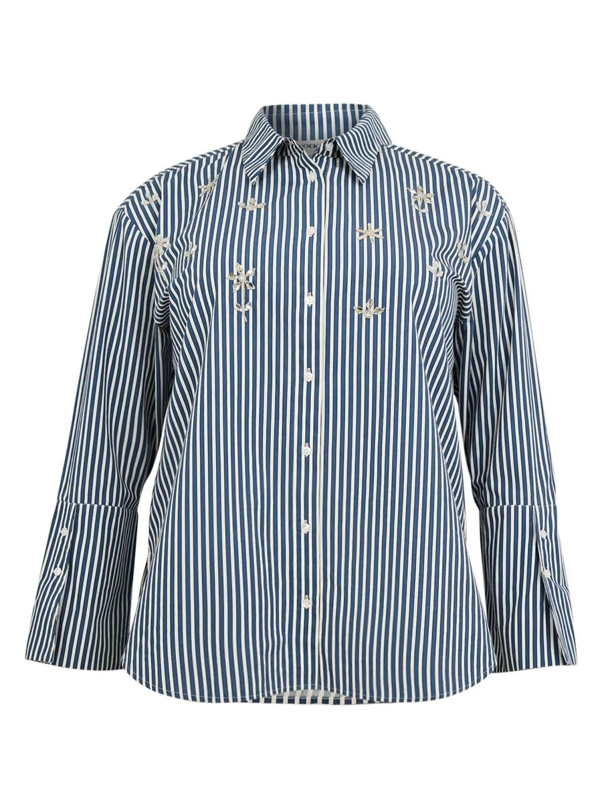 A modern take on a classic stripe, this blouse brings trendy elegance to everyday dressing. The blue-white design is enriched with delicate floral embellishments, adding a subtle feminine touch. Featuring a relaxed silhouette with a longer back, wide cuffs and a classic collar. Easy to pair with denim for a casual look or elevate with tailored trousers for a polished spring outfit.