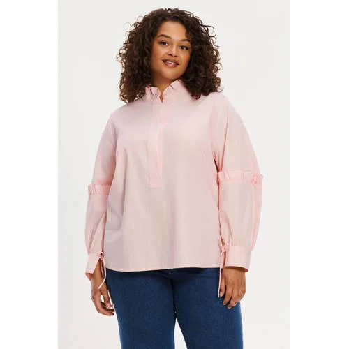 Oh light pink, cotton andruffles! This blouse is your go-to for a fresh spring look. The slightly looser cotton design is finished with refined details: a ruffled stand collar, a subtle split neckline and elegant sleeve ruffles, completed with tie details at the cuffs for a playful touch.