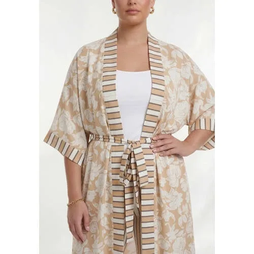 A light palette of beige and white gives this kimono the light summer look we are looking for. Crafted from the dolce fabric with a smooth and stretchy feel. The open-front silhouette and wide sleeves add to its relaxed fit, while a pattern of graphic stripes is contrasted with florals. The tie belt offers the option to create shape. Mix and match it with the other pieces in this resort collection.
