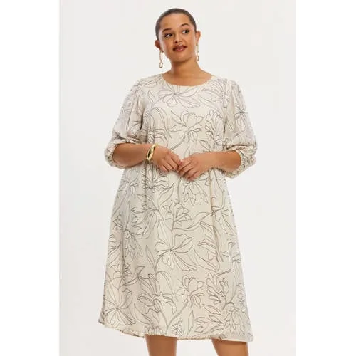 We think you will fall for this beauty of a dress! The design is crafted from a lightweight viscose mix that feels soft, airy and elegant on the skin. The refined floral print in subtle cream tones gives the piece an understated yet luxurious look. Designed in a relaxed, flowing silhouette that moves beautifully with every step, perfect for special occasions. Finished with softly puffed three-quarter sleeves and fully lined except for these sleeves.