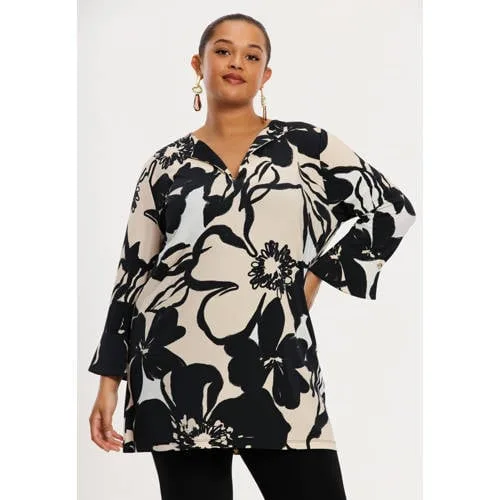 Make an unforgettable entrance in this black-cream floral tunic. The elegant slit neckline adds a feminine touch and subtly elongates the silhouette. Finished with cropped sleeves, of which the cuffs are adorned with golden details. Made of smooth, stretchy dolce. A versatile statement piece that works just as well dressed up as it does styled casually.