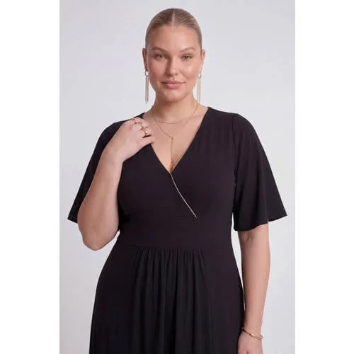 Een tijdloze jurk met een stijlvolle twist. Door de stretch en het bestselling Dolce materiaal voelt de jurk soepel aan en valt ze prachtig langs het lichaam. De subtiele plooien onder de taille creëren een vrouwelijk silhouet met een mooie flow. De gouden belijning langs de halslijn geeft het design een chique en verrassend accent. De korte splitten aan beide zijkanten zorgen voor extra bewegingsvrijheid en een speels detail.