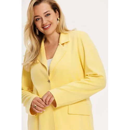 Breng kleur in je garderobe met deze gele blazer van YOEK. De frisse popcorngeel tint geeft elke outfit direct een zomerse uitstraling. De blazer heeft een klassieke reverskraag en sluit met goudkleurige knopen aan de voorkant, wat zorgt voor een verzorgde, vrouwelijke look. Gemaakt van een soepele stof met viscose en een beetje elastaan, waardoor het materiaal zacht aanvoelt en licht meebeweegt.Zomerse blazer met gouden details Popcorngeel, effen design voor een frisse, opvallende kleurboost Klassieke reverskraag en knoopsluiting met goudkleurige knopen Sierklepzakken voor een nette, stijlvolle afwerking Lange, rechte mouwen voor een tijdloos silhouet Regular fit, geschikt voor grotere maten uit het Feminine-assortiment Comfortabele stof met viscose en elastaan voor lichte stretch Ideaal voor de zomer en zeer geschikt als outfit voor een bruiloftsgastStijlen voor verschillende momentenDeze blazer leent zich goed voor een pak in dezelfde kleur, maar staat ook mooi boven een witte broek of lichte denim. Geschikt voor feestelijke momenten, een bruiloft of een zomerse dag op kantoor, waarbij je net wat extra kleur wilt toevoegen.YOEK: mode met aandacht voor pasvormYOEK richt zich op vrouwen met grotere maten die graag mode dragen met een vrouwelijke uitstraling. Het merk staat bekend om modellen met doordachte pasvormen en comfortabele materialen, zodat je je de hele dag goed voelt in je outfit.Een opvallende blazer waarmee je eenvoudig een zomerse en verzorgde look creëert.