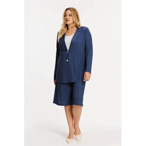 This loose-fit blazer in smooth dolce gives classic pinstripes a trendy update. It features a relaxed silhouette, with a lapel collar and distinctive clover-shaped buttons. An easy statement piece that works seamlessly as part of a co-ord with the matching bermuda or long pair of trousers.