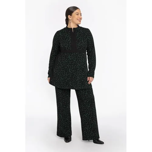 Deze broek van YOEK heeft een regular fit en een hoge taille. De broek is gemaakt van polyester, viscose en elasthan. De lengte is lang en de kleur is donkergroen met zwart.