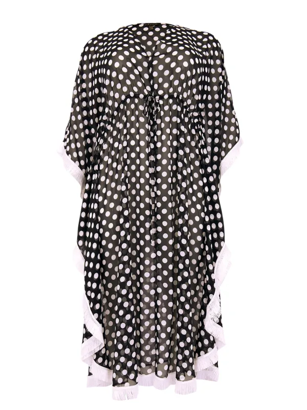 Design: Gefranjerde zoom, Om te knopen/binden; Halstype: V-hals; Motief: Gestippeld; Details: Franjes, Gedrapeerd; Extra's: All-over patroon; Lengte: 7/8 lengte; Pasvorm: Losse pasvorm; Armlengte: Driekwart mouw