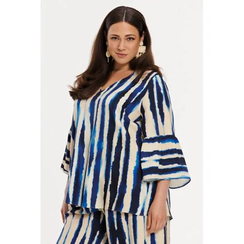 Escape the everyday in this vibrant tunic, featuring an artistic stripe print in deep blue tones on a soft, natural base. Made from fluid lyocell, it drapes beautifully and feels wonderfully lightweight against the skin. The tunic is designed with feminine flared sleeves and a relaxed fit, making it perfect for warmer days or holiday dressing. Pair it with the matching trousers for a co-ord look.