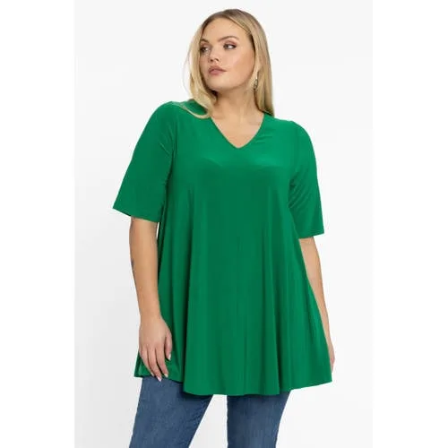 Halstype: V-hals; Motief: Effen; Kraag: Zonder kraag; Details: Plooien; Pasvorm: Wijde pasvorm; Armlengte: Halve mouw; Lengte: Lange pasvorm