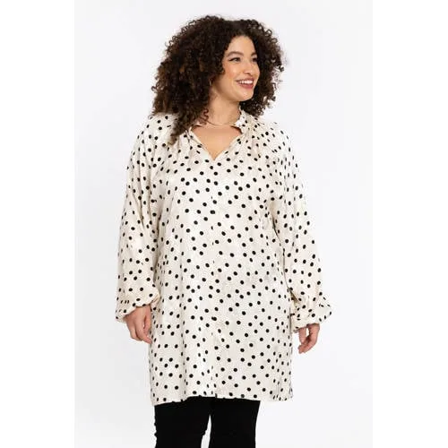 This tunic from YOEK's DOTTY line is a real eye-catcher. The slightly shiny fabric feels supple and falls nicely around your body. The black polka dots give the tunic a playful and feminine look. The tunic has a V-neckline with a small pleat detail at the neckline, adding a subtle touch. The sleeves are slightly puffed and close with an elastic band. Ideal to wear to work, a dinner party or just casual with leggings or tight trousers. Translated with DeepL.com (free version)