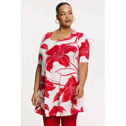 Deze tuniek van YOEK heeft een uitlopende pasvorm en half lange mouwen. De tuniek is gemaakt van polyester en heeft een V-hals. Dit model draag je gemakkelijk bij verschillende stijlen.
