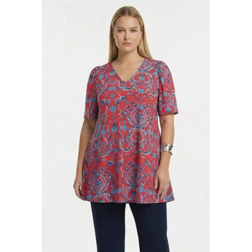 Bring a hint of ocean vibes to your wardrobe with this blue-red printed tunic. The short-sleeved piece is made of the dolce material and has the always popular wide bottom fit. Featuring a flattering V-neckline. Style it casually with jeans or dress it up with a chic pair of trousers.