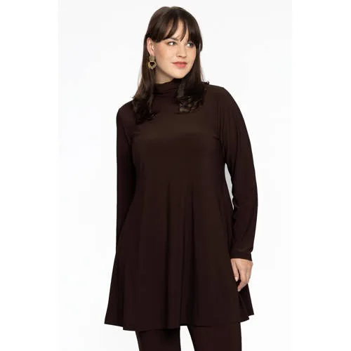 A classic and basic piece to add to your wardrobe is this tunic, featuring a loose turtle neck. The tunic is crafted of the dolce fabric and has a wide bottom fit.