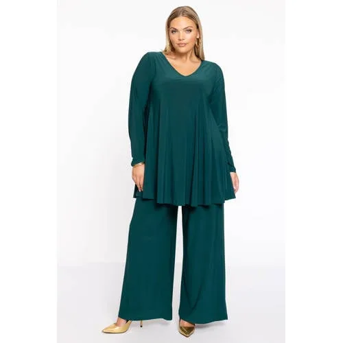 Deze broek van YOEK heeft een hoge taille. De kleur is donkergroen en de broek is gemaakt van polyester. Met zakken draag je dit model makkelijk de hele dag.