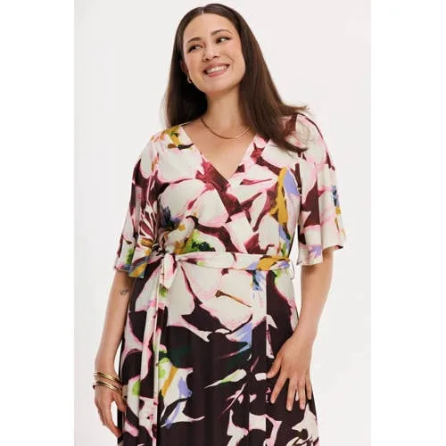 Step into easy elegance with this vibrant wrap dress, crafted from our famous dolce fabric. The flattering wrap design, flowing skirt and flutter sleeves create a feminine silhouette. While the bold, painterly print adds an artistic touch. The matching tie belt allows you to shape the fit to your liking.