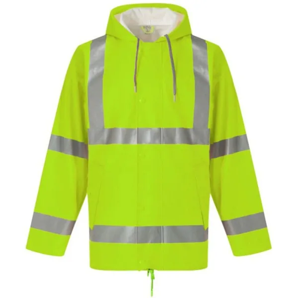 100% Polyester. Voering: Gaas. Stof: PU-coating, zachte aanraking. Ontwerp: Eenvoudig. 210gsm. Stoftechnologie: Ademend, Tochtwerend, Waterdicht. Manchet: Elastiek. High-Vis, Reflecterende Band, Gestikt, Getapete Naden, Gelaste Naad. Halslijn: Kapitein. Mouwtype: Met lange mouwen. Kap Kenmerken: Drop Hood. Zakken: 2 Zijzakken, met knoopsluiting. Sluiting: Verborgen, Volledige ritssluiting, Drukknoop. Zoom: Aantrekkoord. Voldoet aan veiligheidsnorm: EN ISO 20471:2013 Klasse 3, EN343 Klasse 3.3, PBM-verordening (EU) 2016/425. Let op: Reflecterende eigenschappen gaan 25 wasbeurten mee.. Denier: 300D. S: 38 in. M: 42 in. L: 46 in. XL: 50 in. XXL: 54 in. 3XL: 58 in.