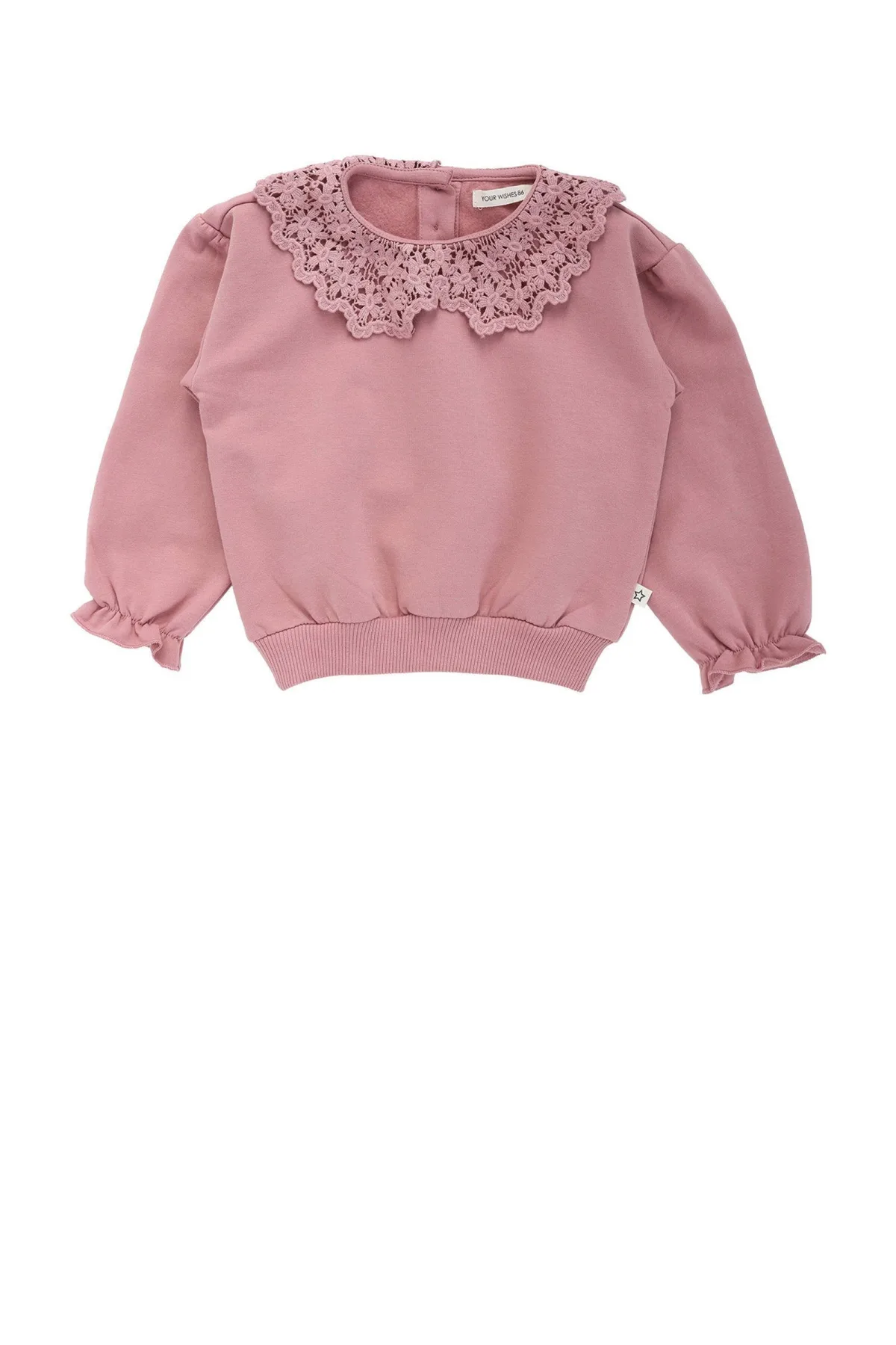 Deze sweater van Your Wishes heeft lange rechte mouwen en een Peter Pan-kraag. De sweater is gemaakt van sweat katoen en elastaan, met broderie en ruches als details. Je draagt het makkelijk en comfortabel.